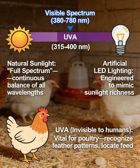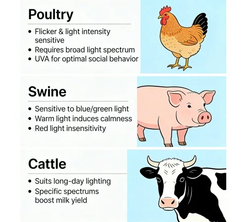 * Poultry: Highly sensitive to flicker and light intensity. They require a broad spectrum including UVA for optimal social behavior.
