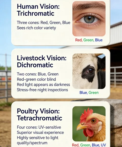 However, most livestock like pigs and cattle are Dichromatic (two cones). They are sensitive to blue and green but are effectively red-green color blind. To them, red light appears as darkness—a biological trait that farmers can use for stress-free night inspections.