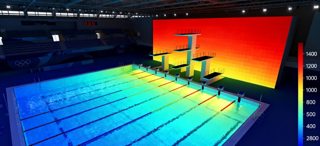 Uniformity ratios – Consistency was key to producing broadcast-ready visuals. Engineers designed the sports stadium LED lighting layout to achieve uniform light distribution across reflective water surfaces and elevated dive platforms. This minimized luminance variation, preventing distracting hotspots or shadowed zones and ensuring smooth, professional-quality images throughout live coverage.