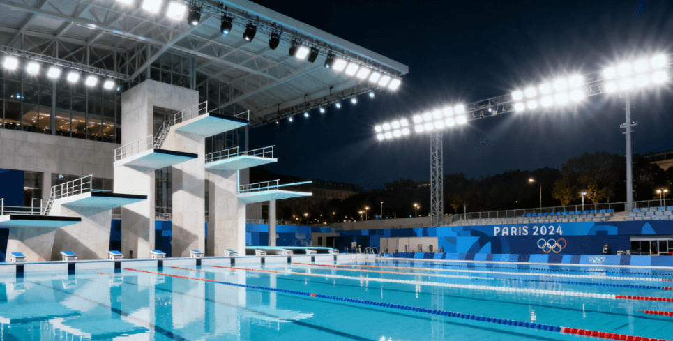 Lighting water-based sports is uniquely complex. Reflections, high-speed movement, multiple camera angles, and athlete sightlines all need to be balanced in one integrated scheme. At Paris 2024, LED stadium lighting design followed four key principles: