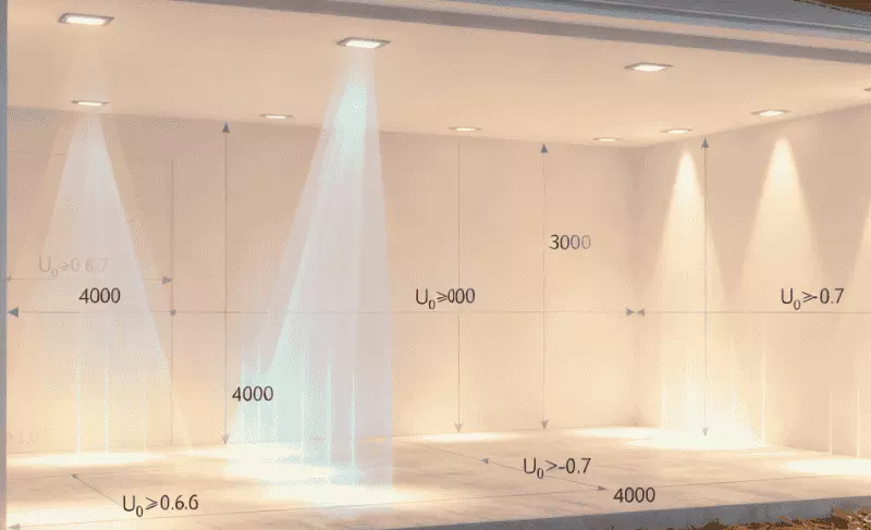 Uniform lighting layout achieving U₀ ≥ 0.6–0.7 across the entire house