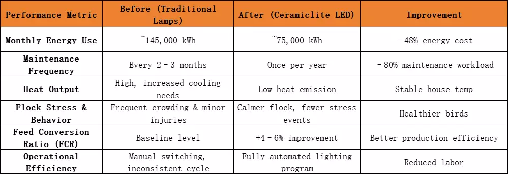 This project shows how replacing outdated barn lighting with Ceramiclite T21 high-efficiency LED fixtures led to practical improvements in daily farm operations—more consistent flock behavior, easier system management, and noticeably lower long-term energy and maintenance costs.