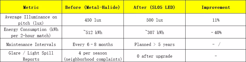 “The difference before and after the upgrade is remarkable. Our metal-halide lamps often flickered and dimmed halfway through a match, especially during humid seasons. With the SL05 system, light levels stay perfectly stable from kickoff to the final whistle—and our energy bill dropped immediately.”