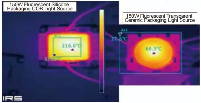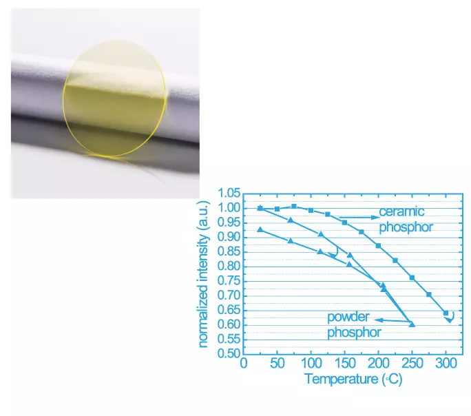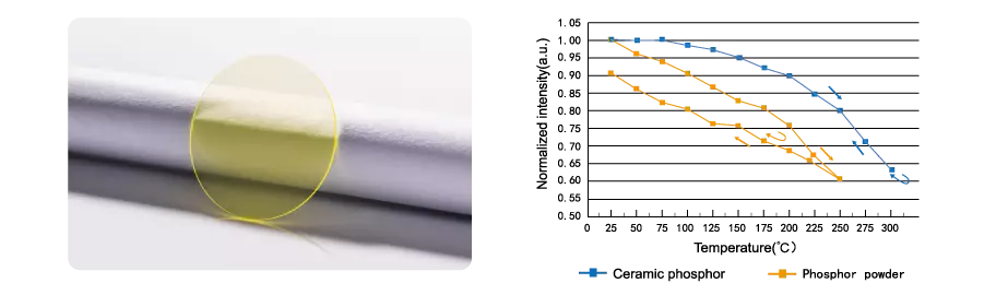 Die interne Quanteneffizienz (IQE) des fluoreszierenden, transparenten Keramik-LED-Chips beträgt bei 150 °C, 200 °C und 250 °C jeweils 1 %, 7 % bzw. 15 % derjenigen bei Raumtemperatur. Die interne Quanteneffizienz (IQE) des Leuchtstoffpulvers liegt hingegen bei 22 %, 35 % bzw. 45 %.