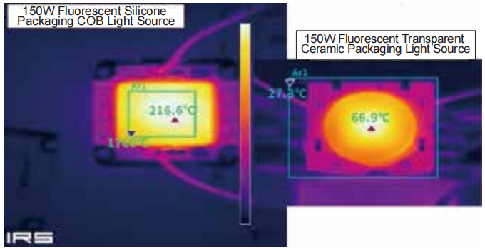 ①The thermal resistance is 50 times lower compared to traditional phosphor silica gellight source, the lowest data can reach 0.018K/W, the area of the 1000W-COB-LED light source is only 75mm in diameter, the thermal resistance is 0.0375K/W, and the average surface temperature of the light source is only 89℃ when reaching the stable thermal state;