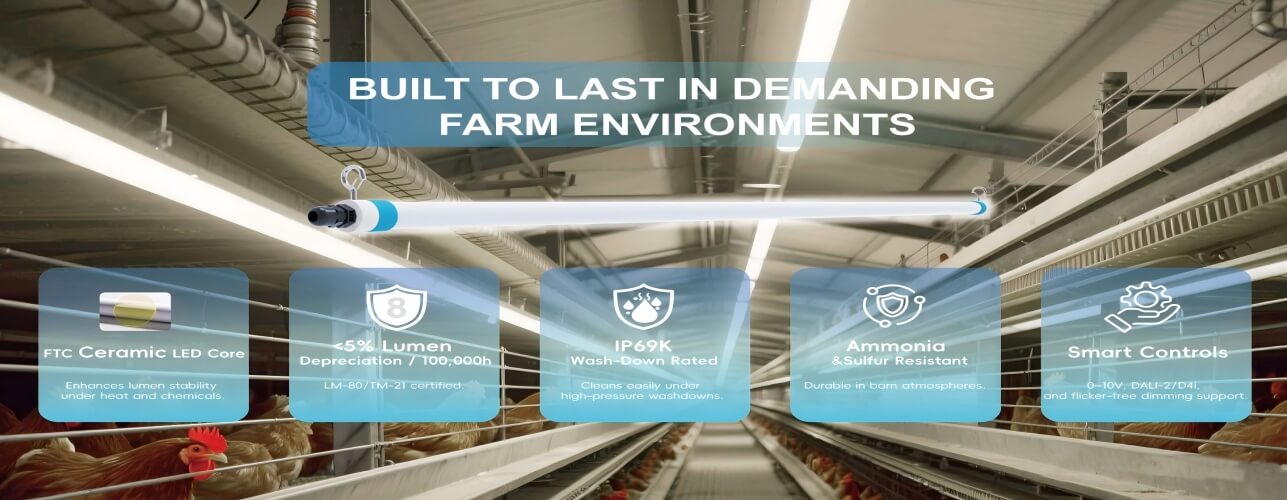 T5 LED barn light system provides solution for chickens to increase egg output, lower mortality, longer peak production period and improve animal welfare.
