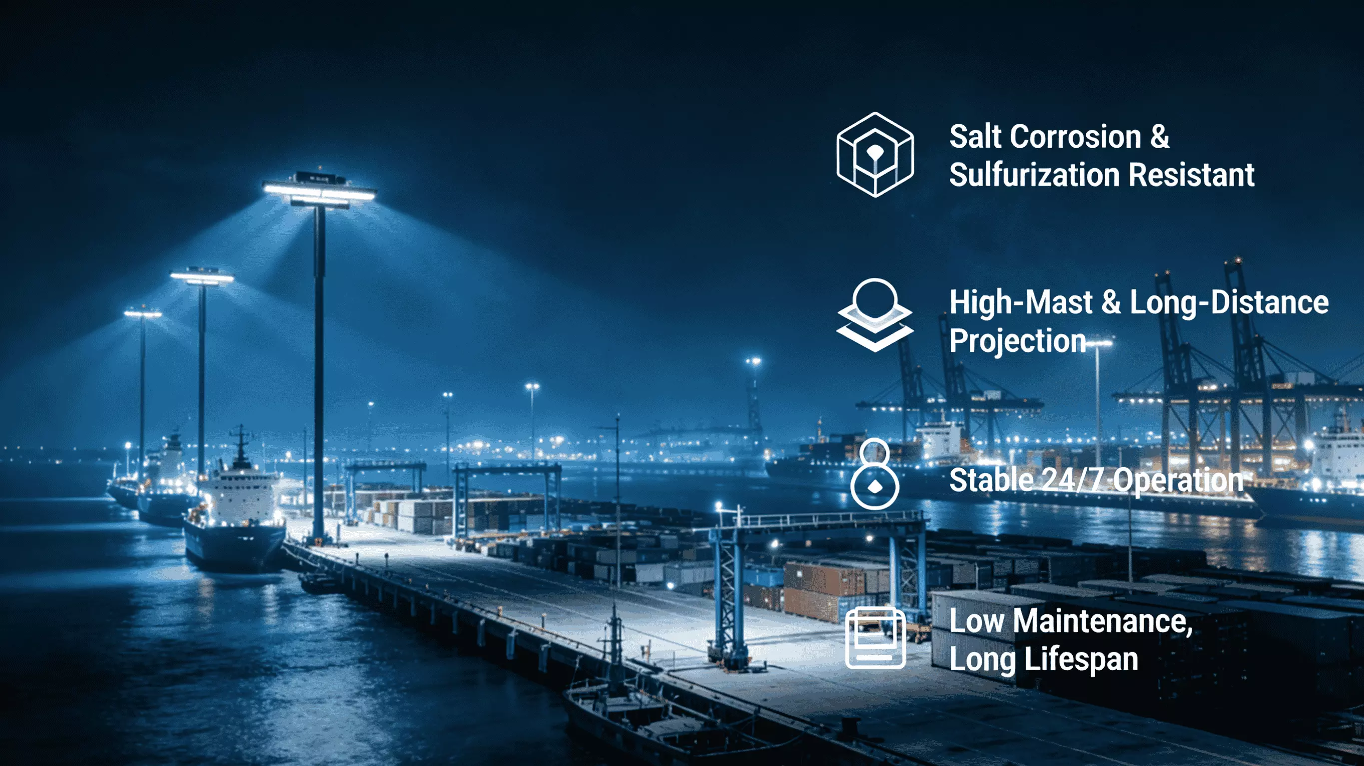 In addition, port, dock and harbor environments face extreme challenges, including high salt mist, constant humidity, corrosive air, high-mast installations at 20–45 meters, 24/7 continuous operation, and mixed application scenarios across shorelines, docks and container yards.